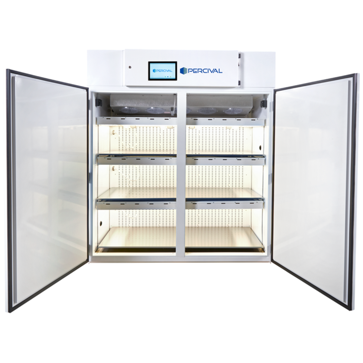- Air circulation inside chamber is from a specifically designed air diffuser (air travels along entire back wall, over the shelves and returns to the ceiling fans through an opening between the light fixtures and the doors)