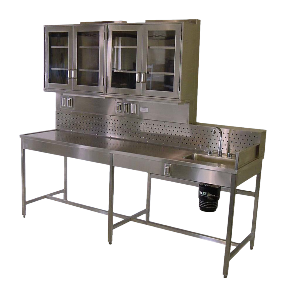 The TBJ Model 32-102-S BD-WB-VC backdraft workbench includes two integral vented storage cabinets with hinged doors. The standard design includes a sink with hot/cold water faucet, 1 horsepower disposer, two 24″ under cabinet fluorescent light fixtures, two GFCI receptacles and two data ports.