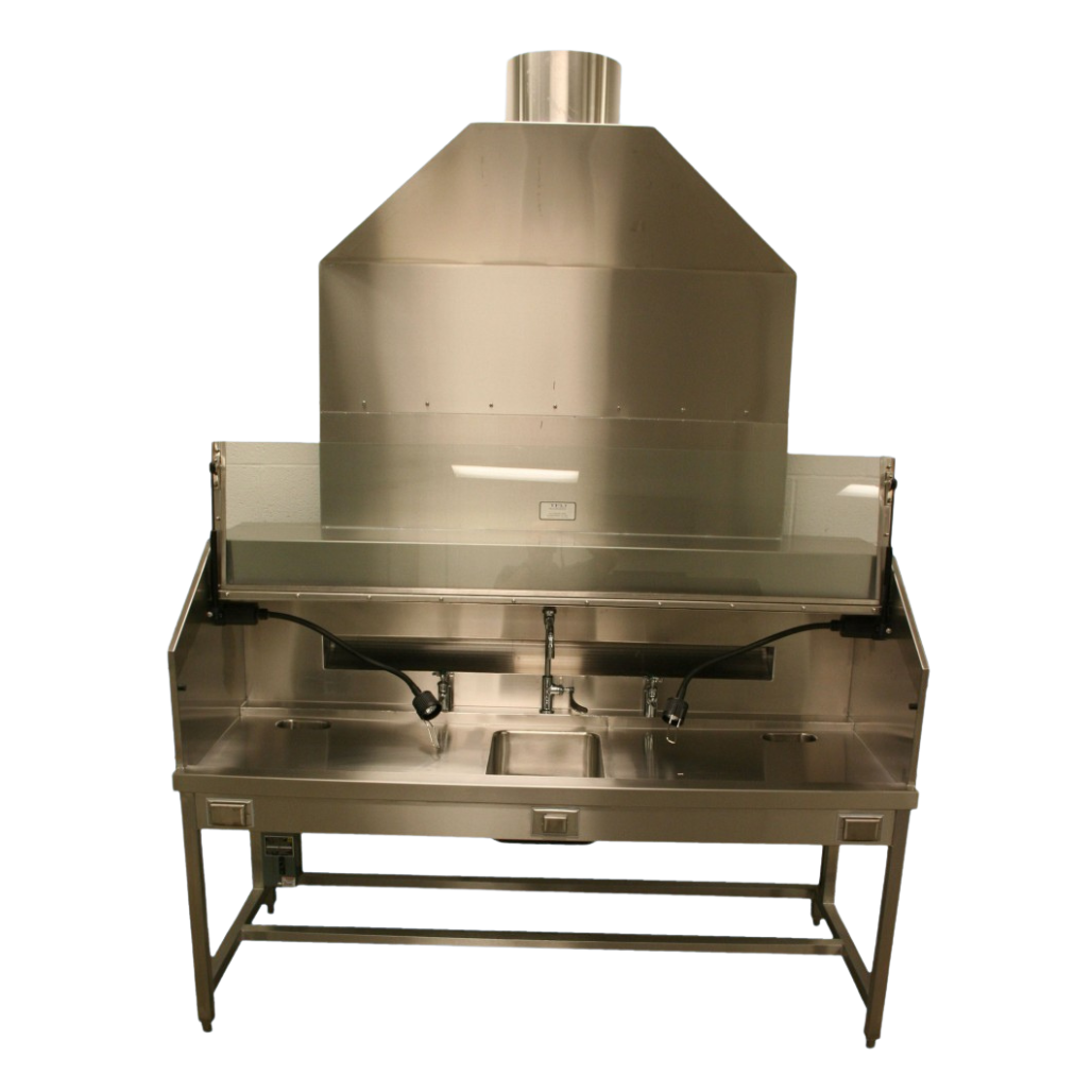 The TBJ Model 29-72-S BD-SE semi-enclosed backdraft workstation is similar to the 25-60-S BD but is deeper and wider. It is shown here with a center sink with cold water faucet, two low flow cold water outlets with serrated ends for specimen rinsing, two formalin cup sinks with collection carboy connections, two task lights with magnifiers and two GFCI outlets.