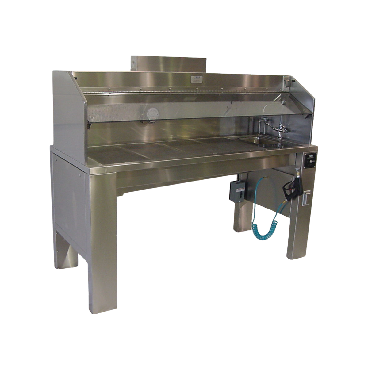 - Sink with hot/cold faucet, spray gun, flush manifold and GFCI outlet standard