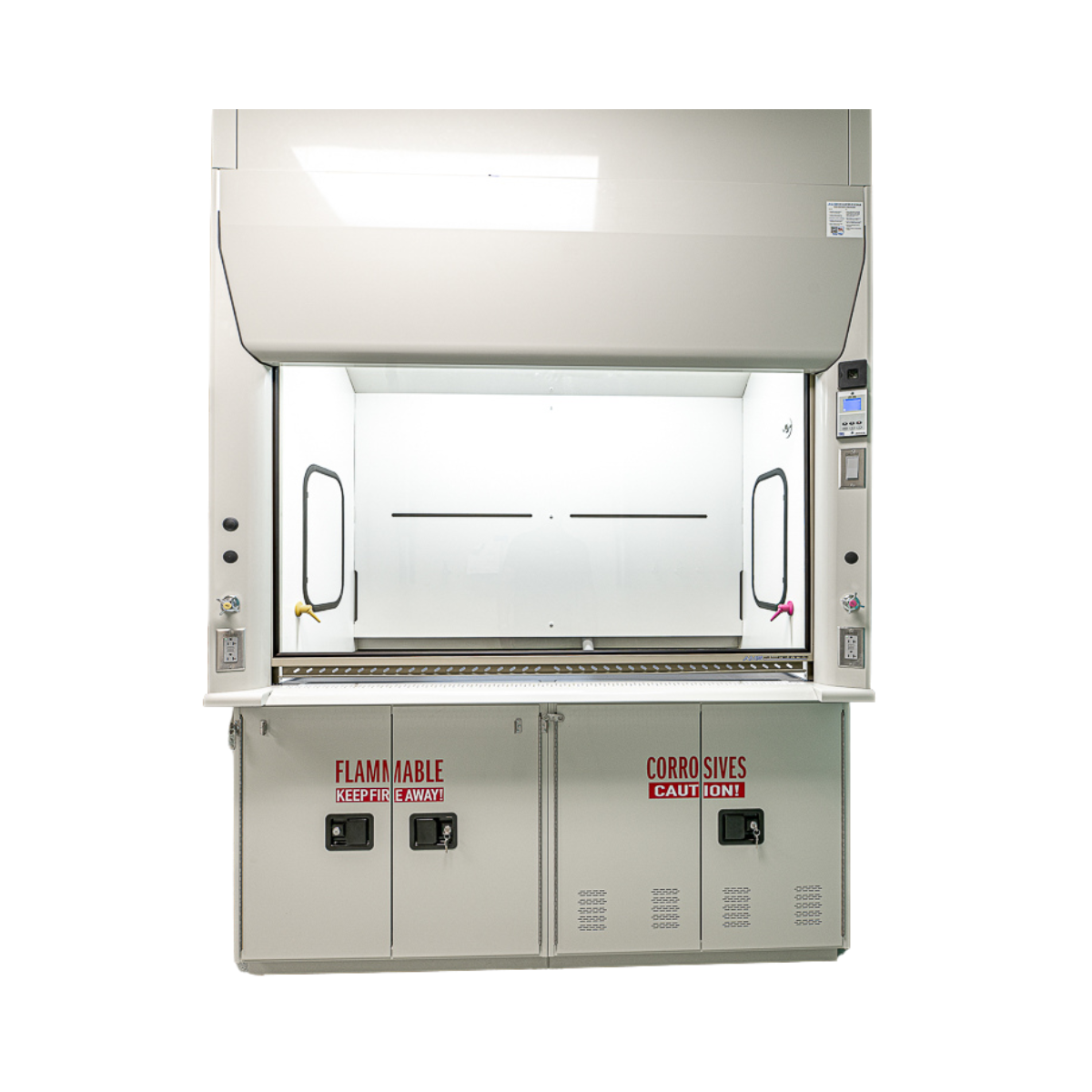 The Solution Series Solution Work Station laboratory fume hood’s design allows for back-to-back and side-by-side configurations for flexibility in designing undergraduate teaching and learning labs. It is available in varying sizes from a worktop width of 48″ with a hood opening of 37.5″ to a full 72″ worktop with a hood opening width of 61.5″. Since the point of a fume hood is to keep people safe, we install front-loaded valves with plumbing outlets within arms’ reach, while your head is outside of the sash.