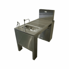 The TBJ Model 30-60 DD is a mid-size downdraft workstation designed for safe specimen handling and efficient laboratory workflows. Standard features include a spray gun and flush manifold, with optional upgrades such as a power strip, custom overhang extension, lab gas outlets, and magnehelic gauge for enhanced utility. An optional integral sink with hot/cold water faucet is available for added workflow flexibility.